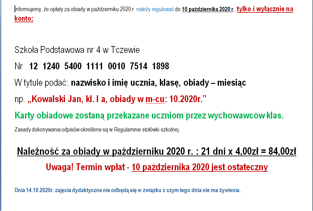 Opłata - obiady - październik 2020