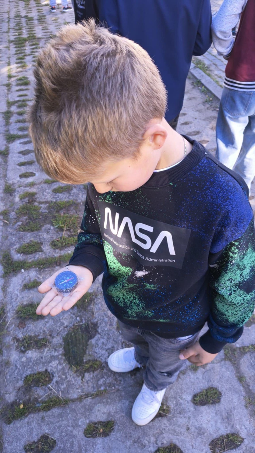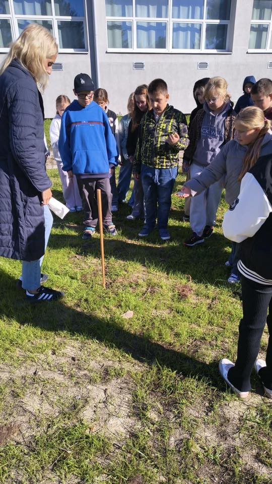 Uczniowie klasy 4b zamienili dziś szkolne mury na plener, by wziąć udział w niezwykłej lekcji przyrody. Z pomocą gnomonu (słupek i cień) oraz kompasu uczyli się wyznaczać kierunki geograficzne w praktyce. 🌍🧭