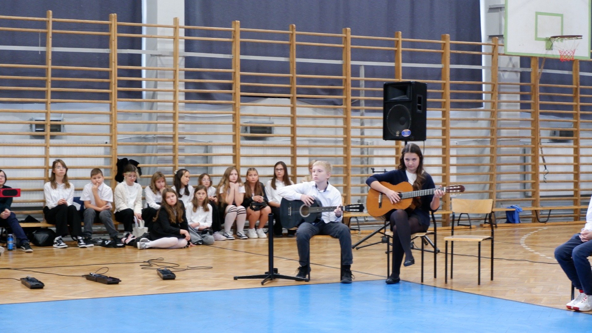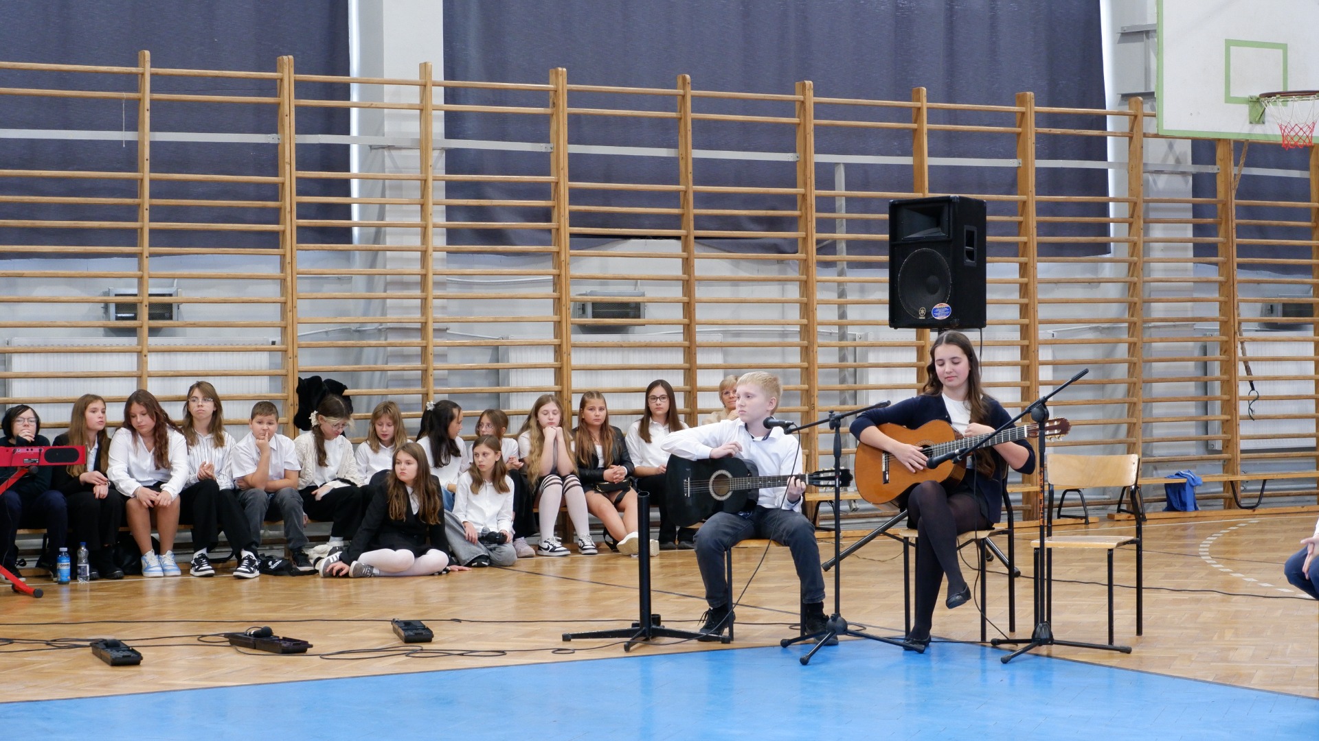 Uroczystość uświetniła piękna część artystyczna, przygotowana przez uczniów z klasy 5D i 3B pod opieką Pani Agnieszki Michalskiej oraz Pani Lidii Kality-Glab. Uczniowie w humorystyczny, ale i wzruszający sposób przedstawili codzienność szkolną, składając życzenia wszystkim pracownikom szkoły.