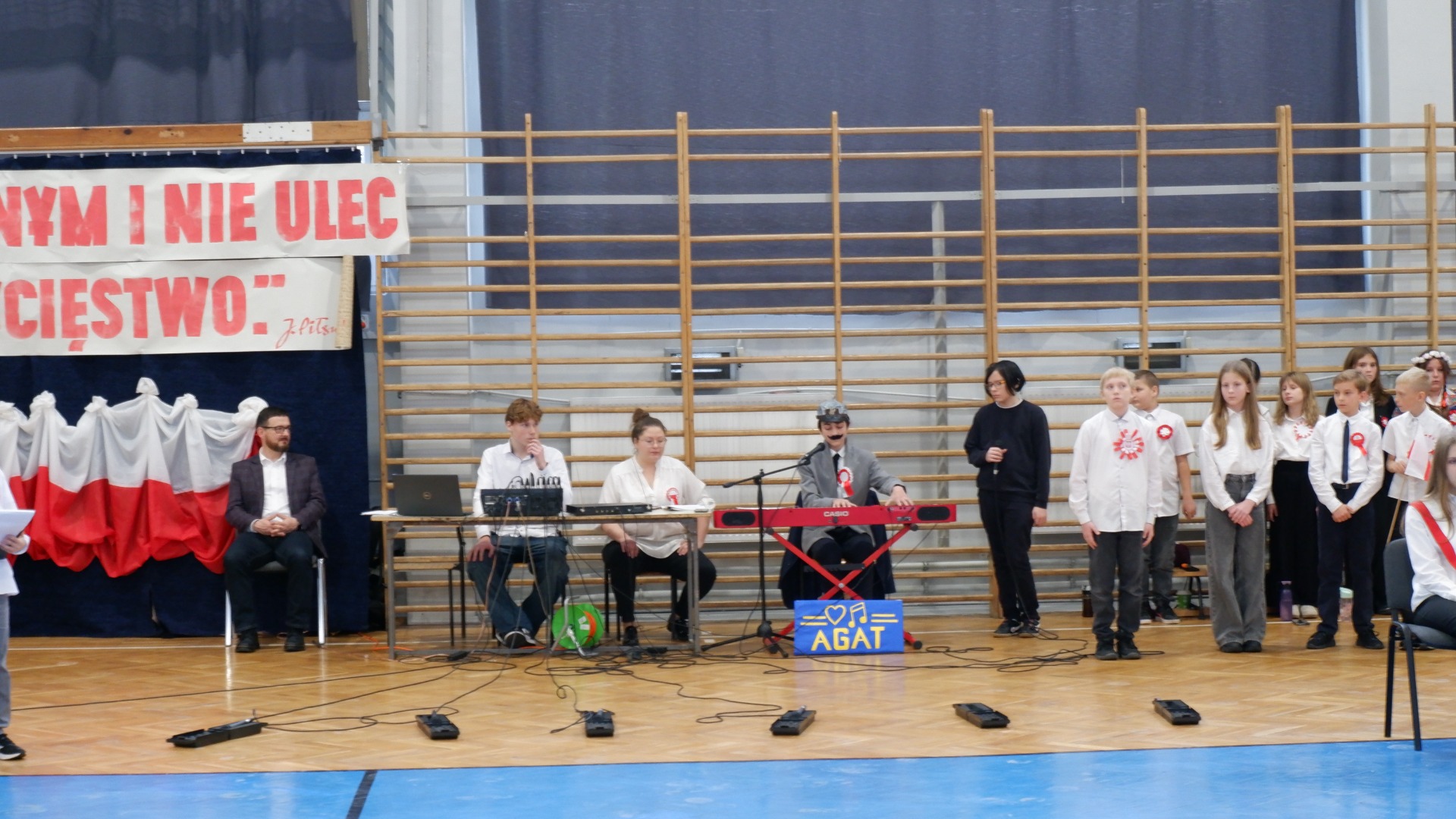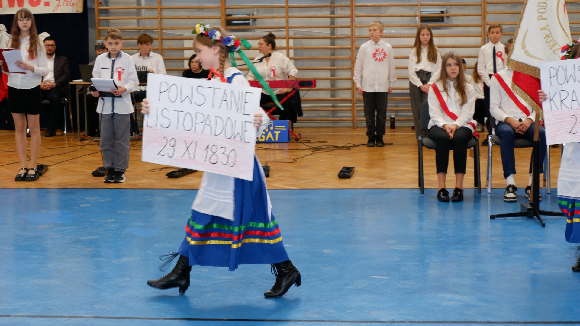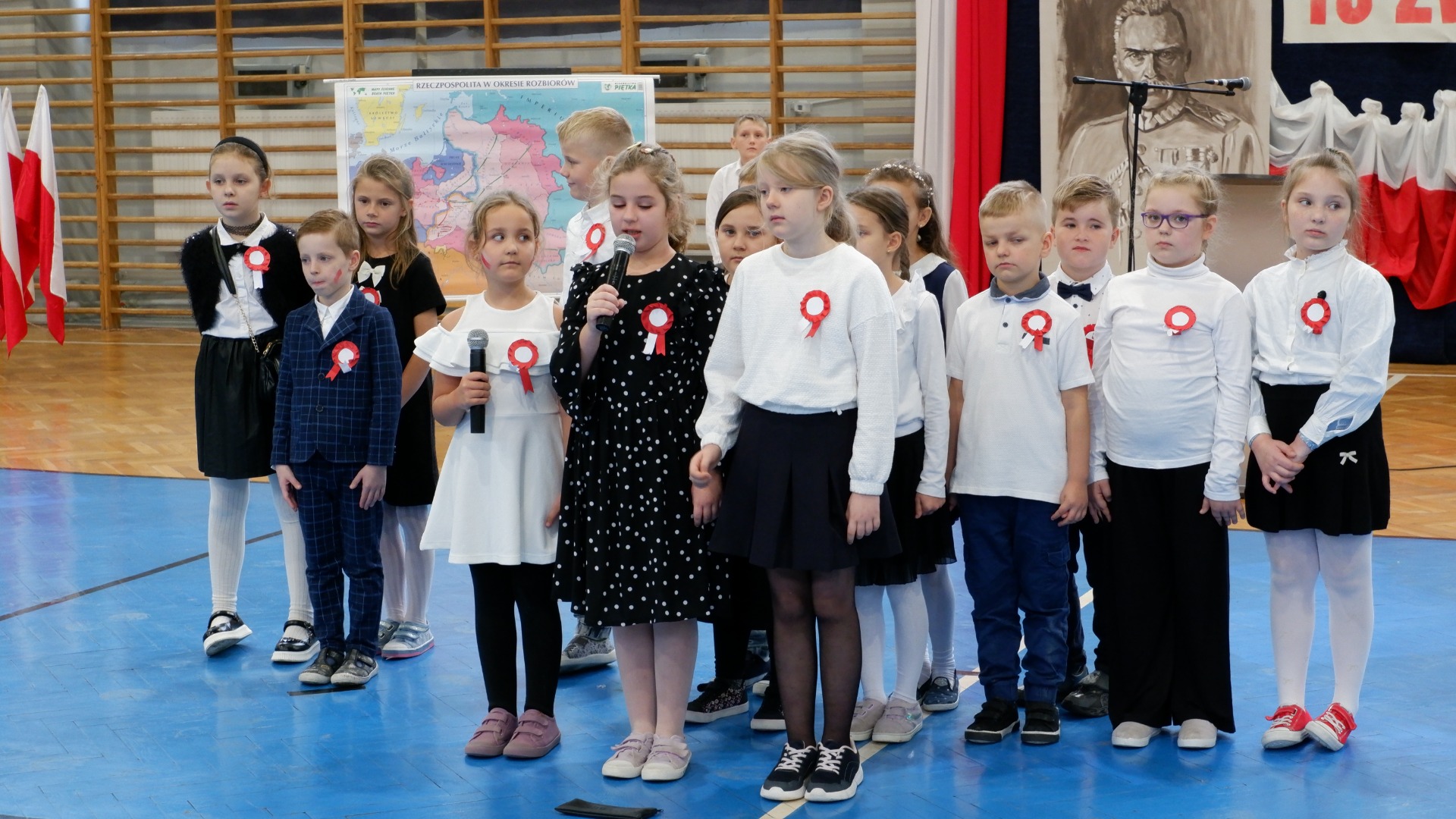 Uroczystość rozpoczęła się wspólnym, podniosłym odśpiewaniem hymnu narodowego, w którym wzięli udział wszyscy uczniowie, nauczyciele oraz pracownicy szkoły. Następnie uczniowie zaprezentowali najważniejsze wydarzenia w historii Polski prowadzące do odzyskania niepodległości w 1918 roku.