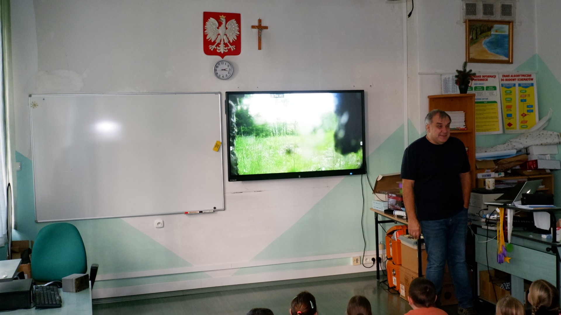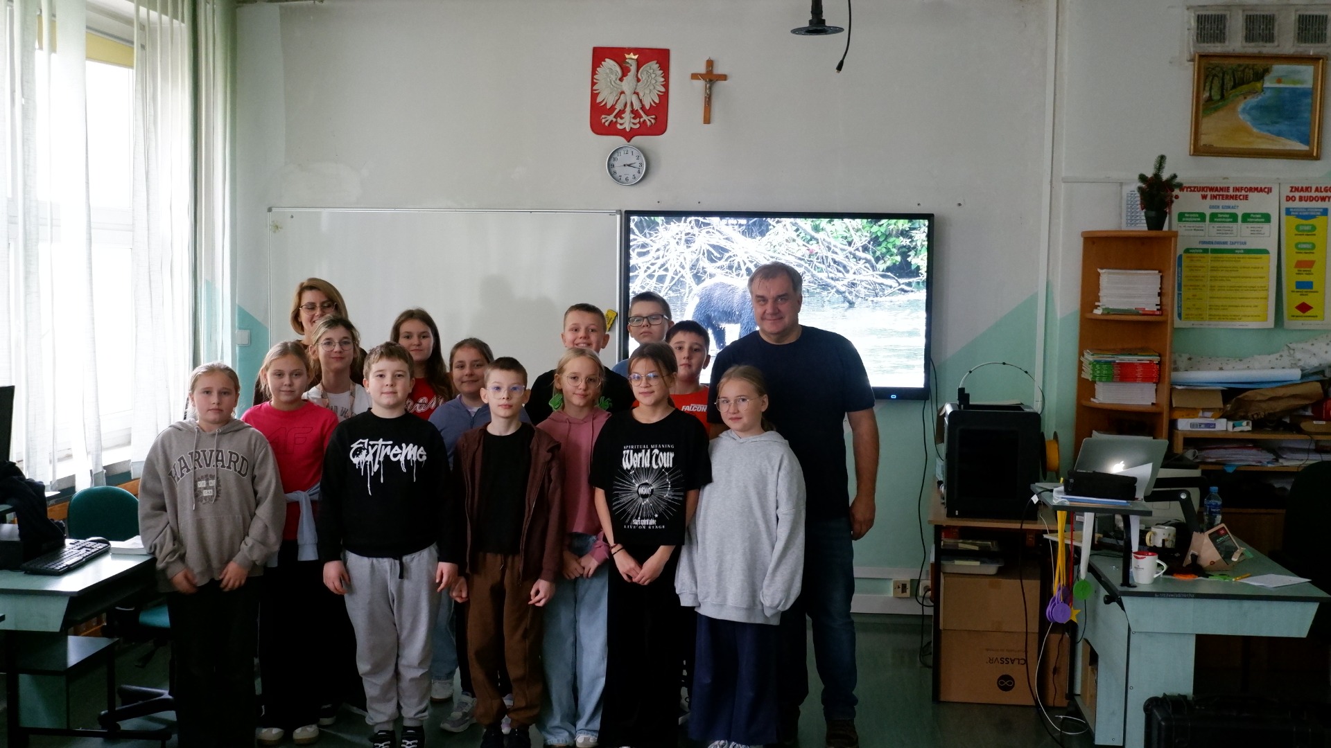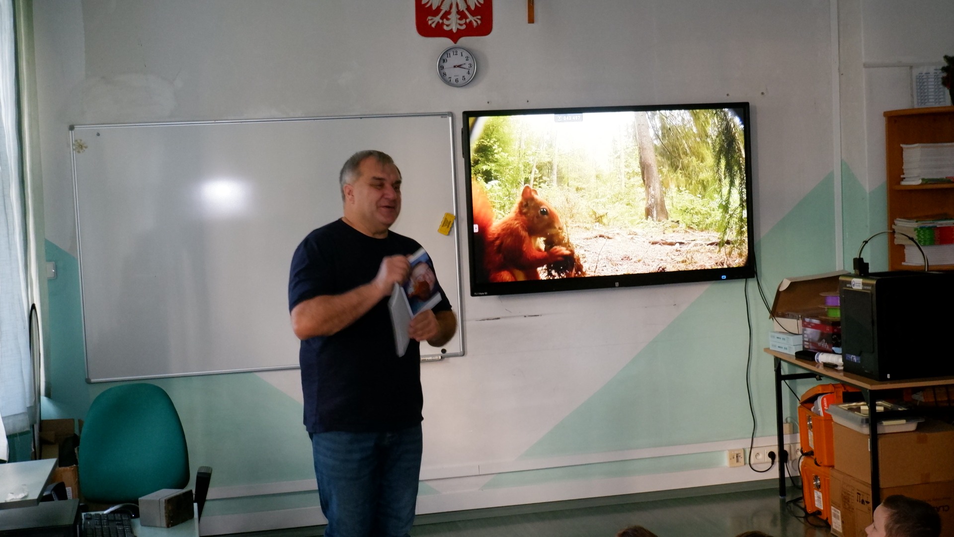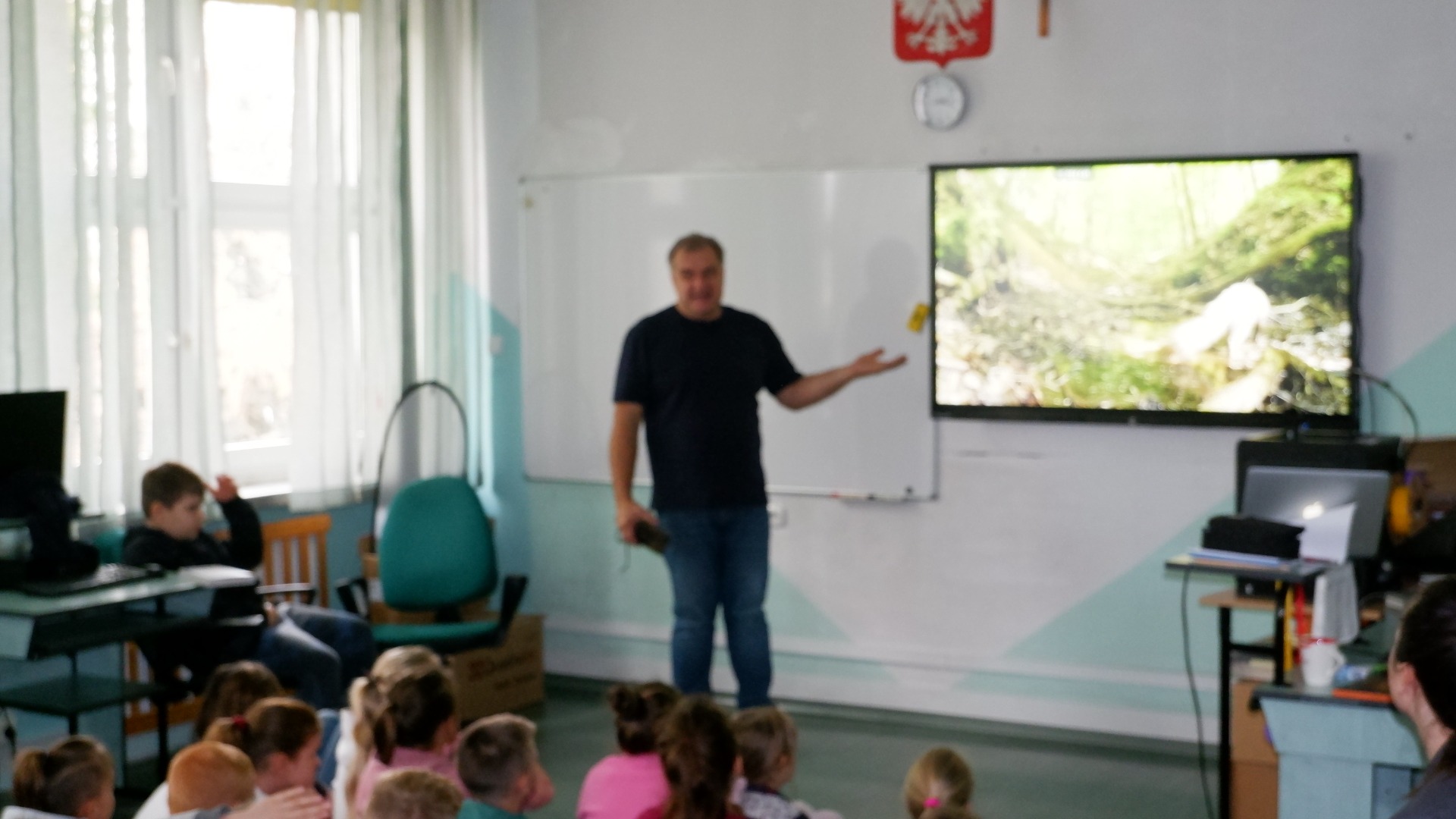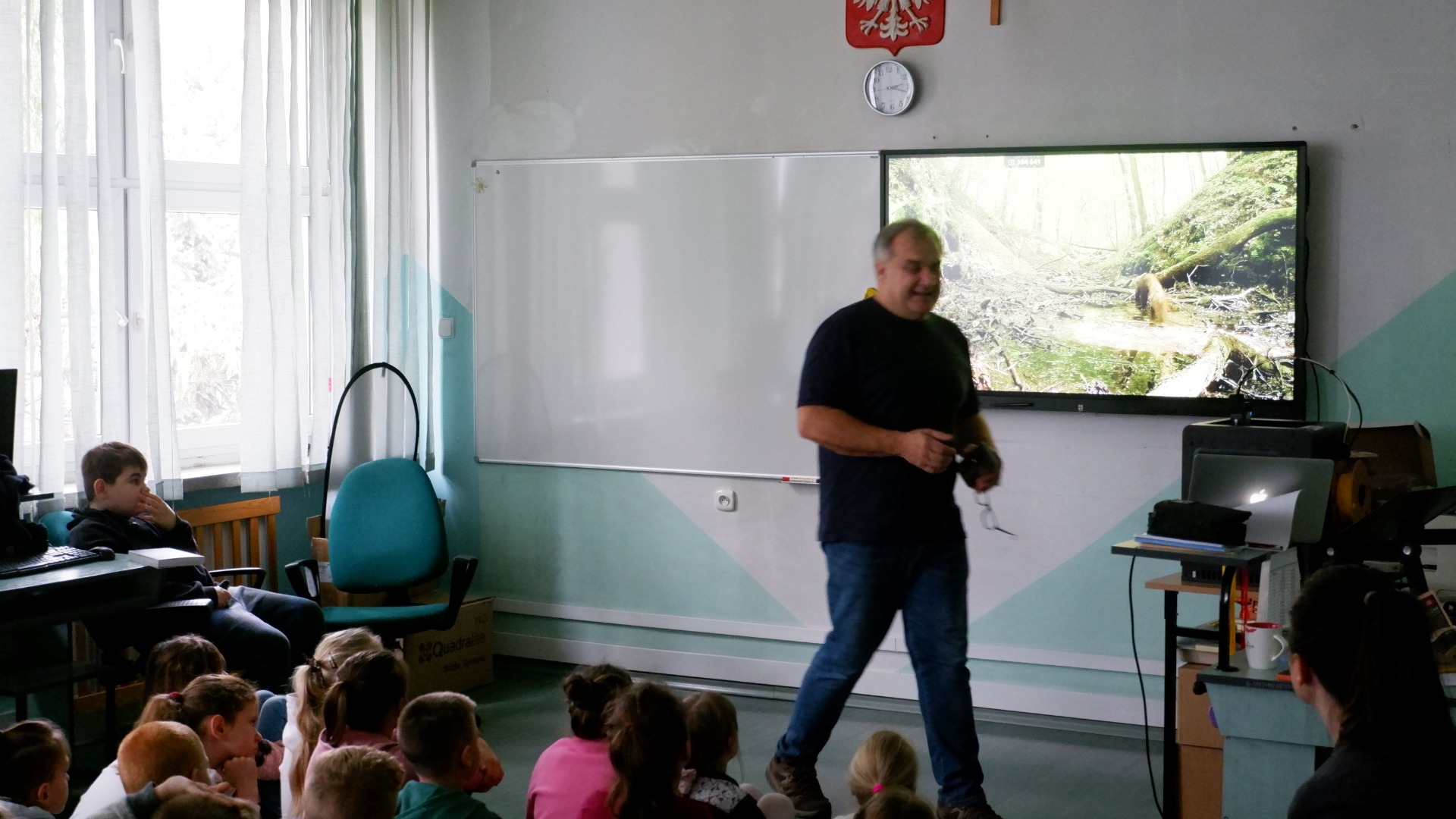 Spotkanie było pełne fascynujących opowieści o zwierzętach żyjących w polskich lasach. Pan Marcin w ciekawy i przystępny sposób dzielił się swoją wiedzą oraz wyjątkowymi historiami z pracy w terenie. Uczniowie z ogromnym zainteresowaniem słuchali prezentowanych ciekawostek, a także mieli możliwość zadawania pytań, dzięki czemu warsztaty stały się jeszcze bardziej angażujące.