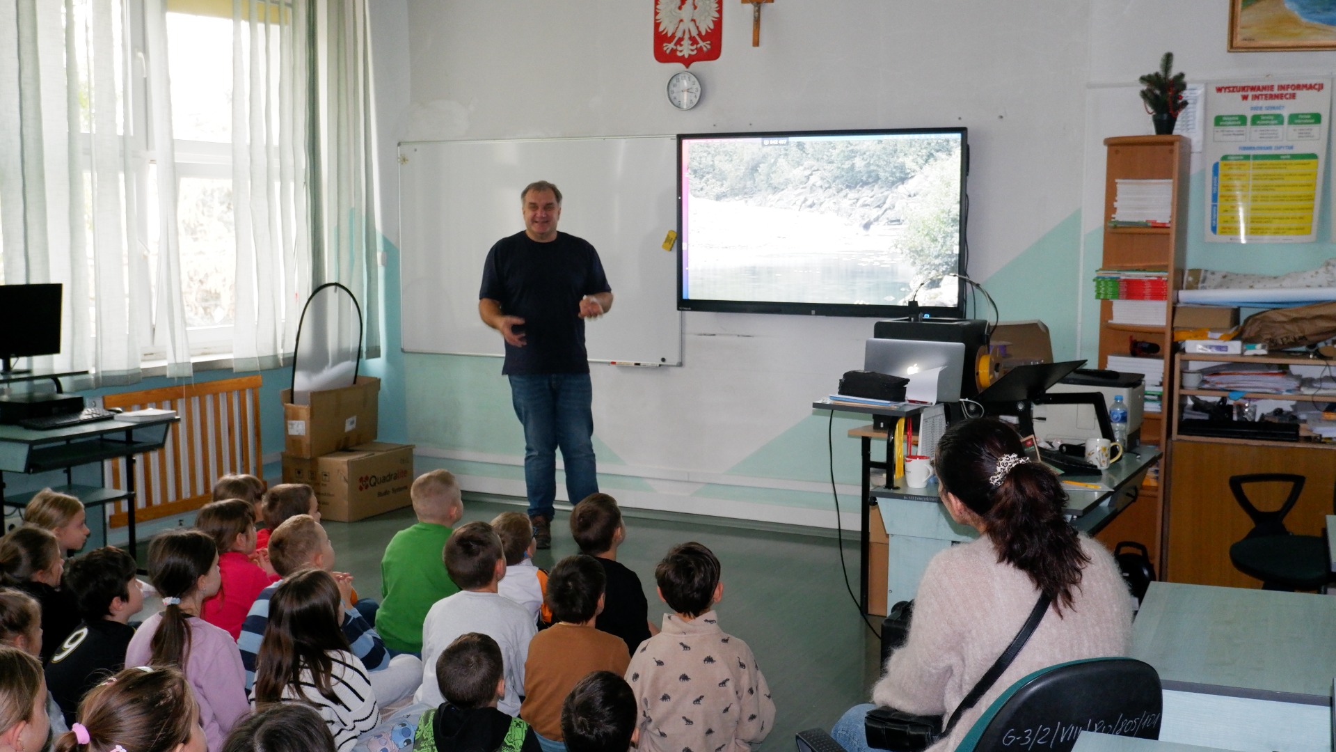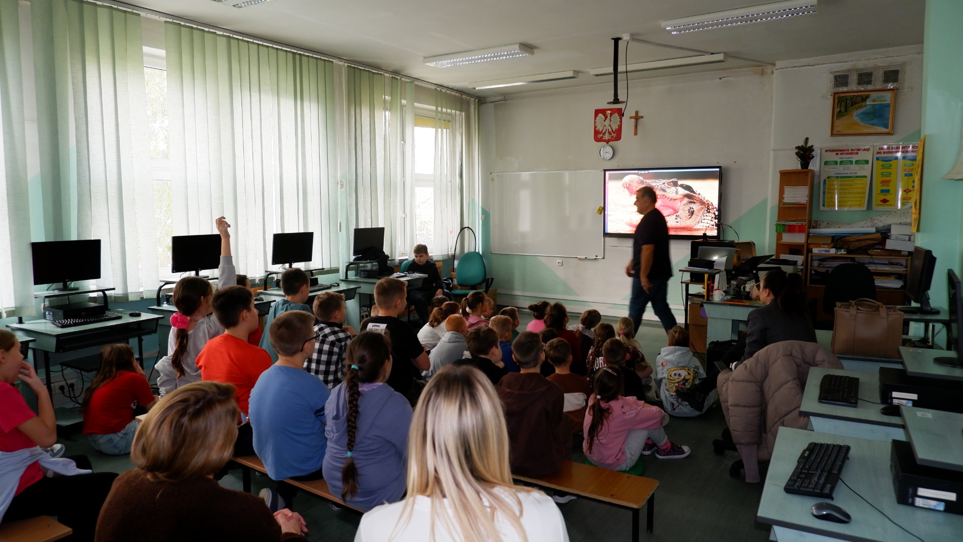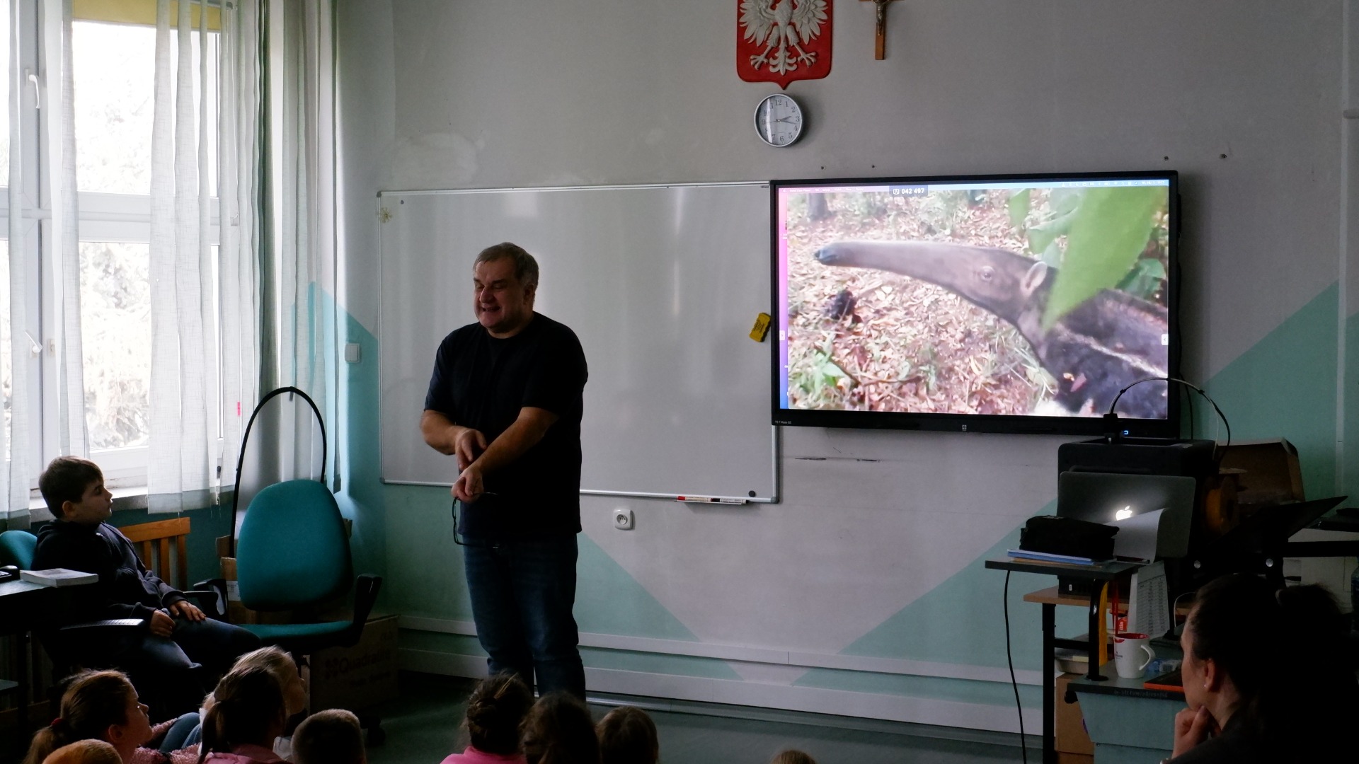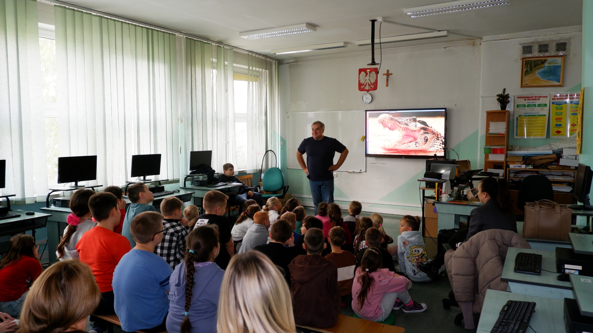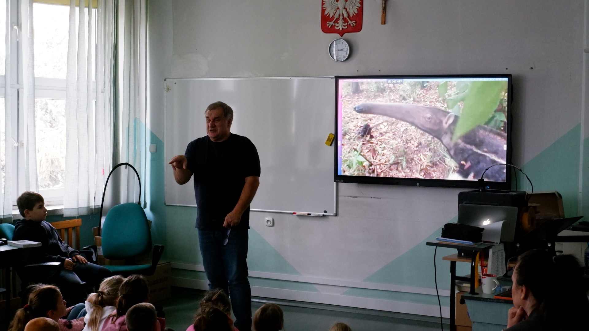 Spotkanie było pełne fascynujących opowieści o zwierzętach żyjących w polskich lasach. Pan Marcin w ciekawy i przystępny sposób dzielił się swoją wiedzą oraz wyjątkowymi historiami z pracy w terenie. Uczniowie z ogromnym zainteresowaniem słuchali prezentowanych ciekawostek, a także mieli możliwość zadawania pytań, dzięki czemu warsztaty stały się jeszcze bardziej angażujące.