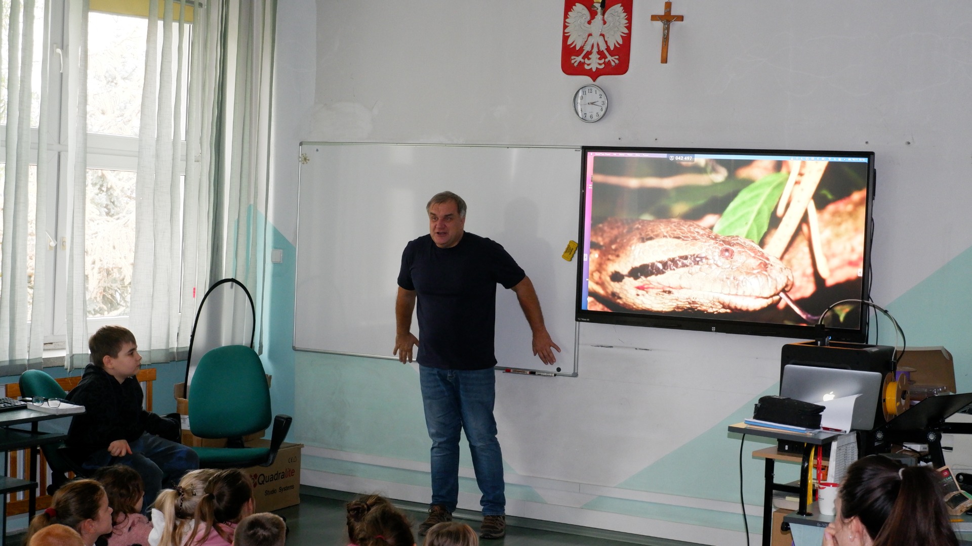 Dnia 18 listopada uczniowie klas 0–4, a także uczniowie jednej z klas ósmych, mieli niezwykłą okazję uczestniczyć w warsztatach w ramach edukacji ekologicznej prowadzonych przez Pana Marcina Kostrzyńskiego – ekologa, leśnika i prawdziwego pasjonata przyrody.